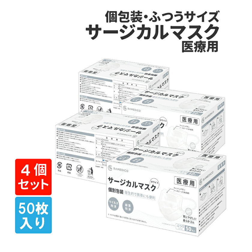サージカルマスク 50枚入×4箱 個別包装 医療用 クラス2 個包装 ふつうサイズ RAMEDICO KE721 WHITE 白 日本産業規格適合 不織布 大人用 平ゴム 立体プリーツ 99%ウイルスカットフィルター