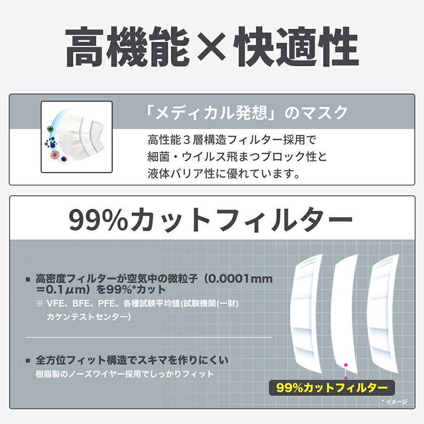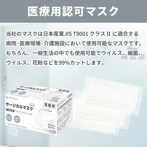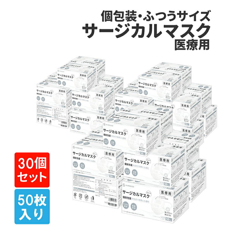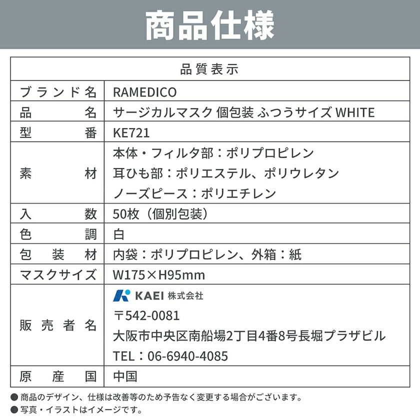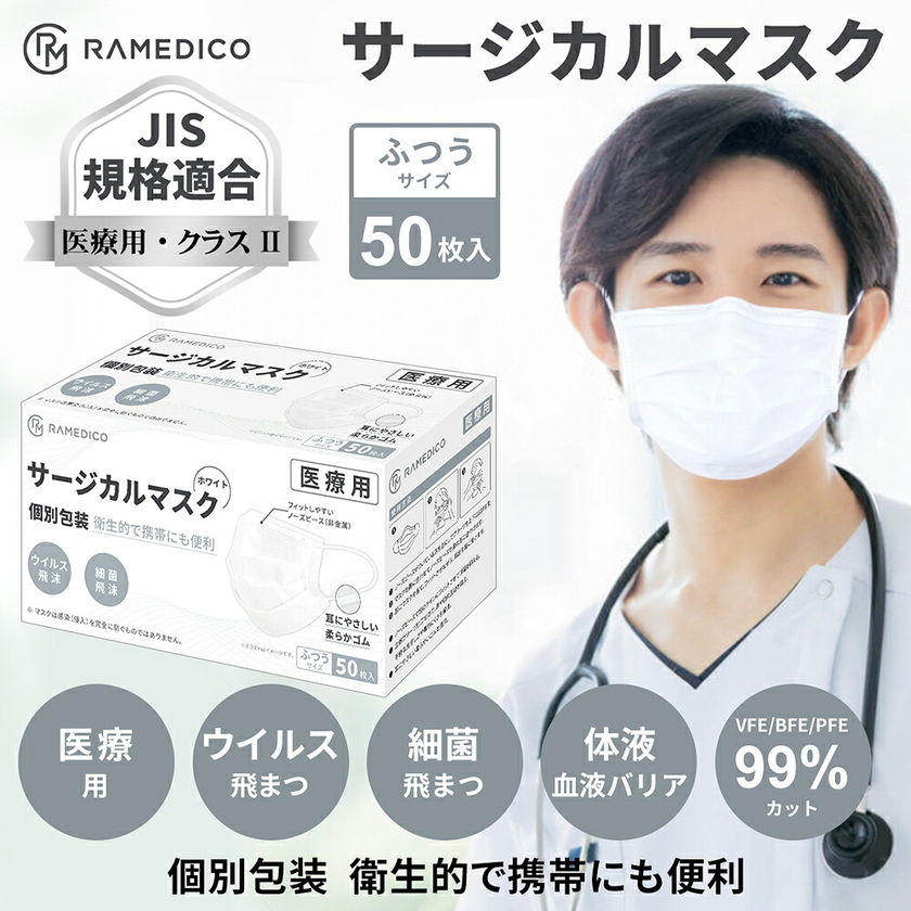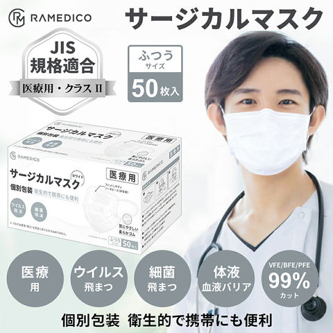 サージカルマスク 50枚入×30箱(1ケース) 個別包装 医療用 クラス2 個包装 ふつうサイズ RAMEDICO KE721 WHITE 白 日本産業規格適合 不織布 大人用 平ゴム 立体プリーツ 99%ウイルスカットフィルター