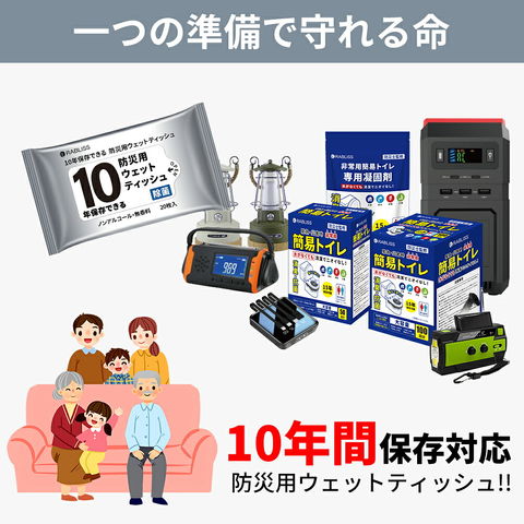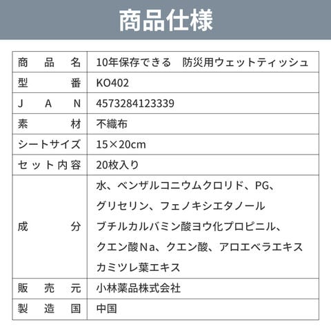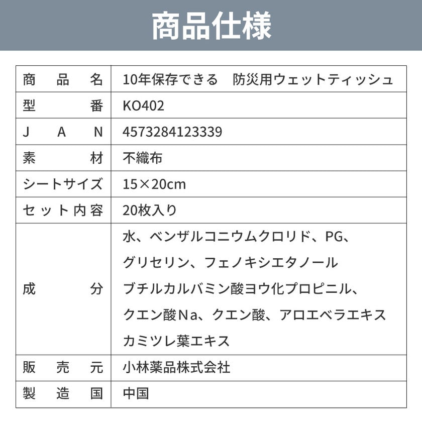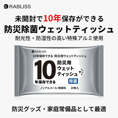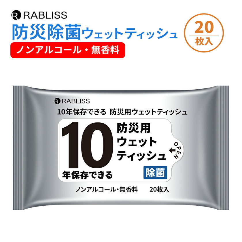 10年保存できる ウェットティッシュ 防災用 ノンアルコール 無香料 衛生用品 長期保存 防災グッズ ティッシュ 水害 災害 地震 台風 洪水 避難 耐光性 防湿性 20枚入り 介護 除菌 食事 KO402 RABLISS (メール便10個まで)