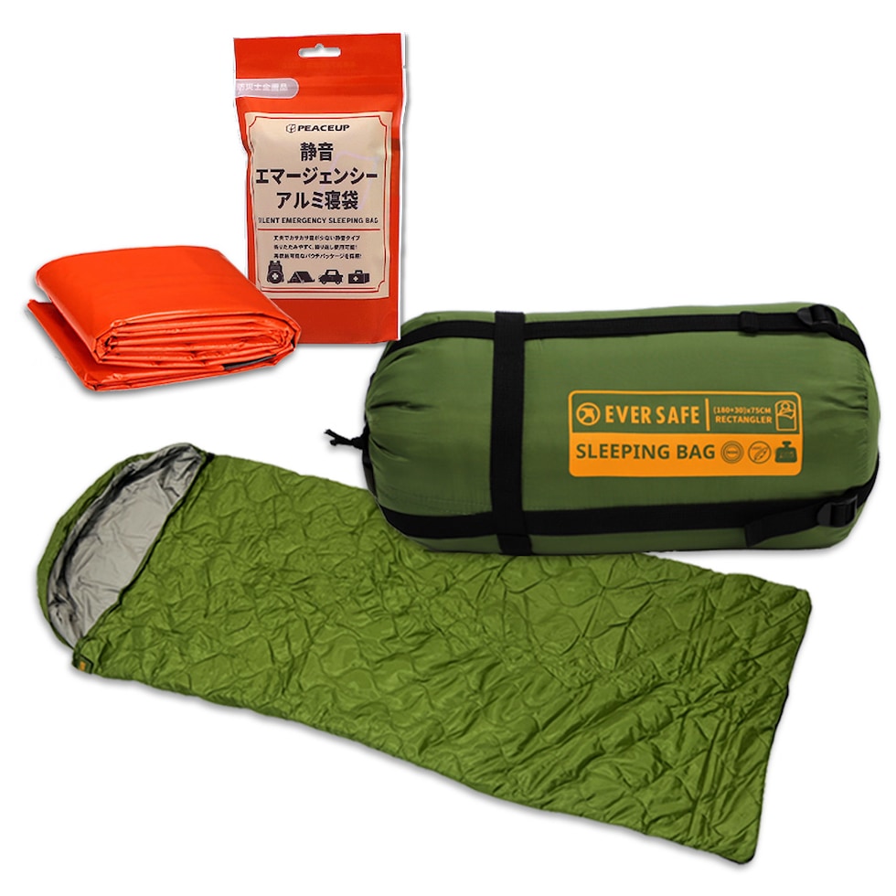 防災用品 SLEEPING BAG カーキ 1人用+静音アルミ寝袋セット 封筒型 寝袋 シュラフ 800g アルミ寝袋 セット 軽量 コンパクト 1人用 シングル 5色 レクタングラー 防災用 避難時 災害対策 オールシーズン 車中泊 防寒 登山 キャンプ 省スペース EVERSAFE