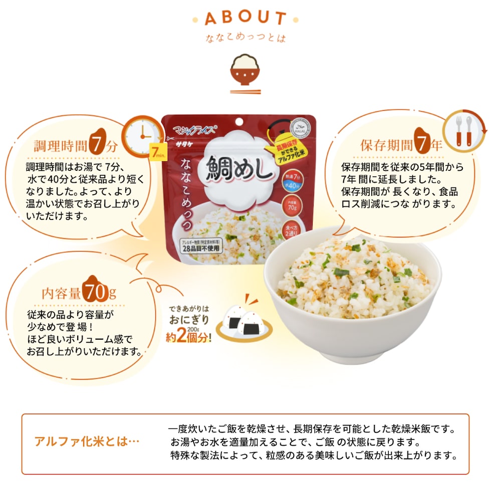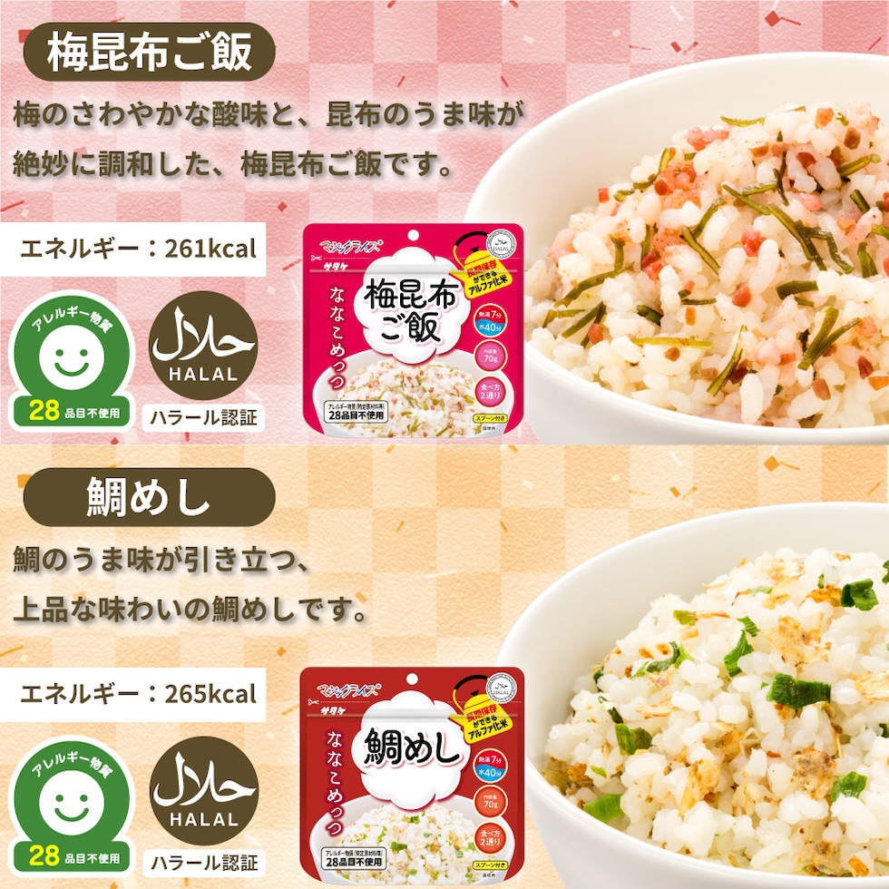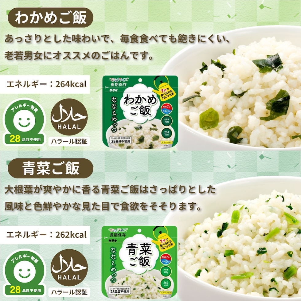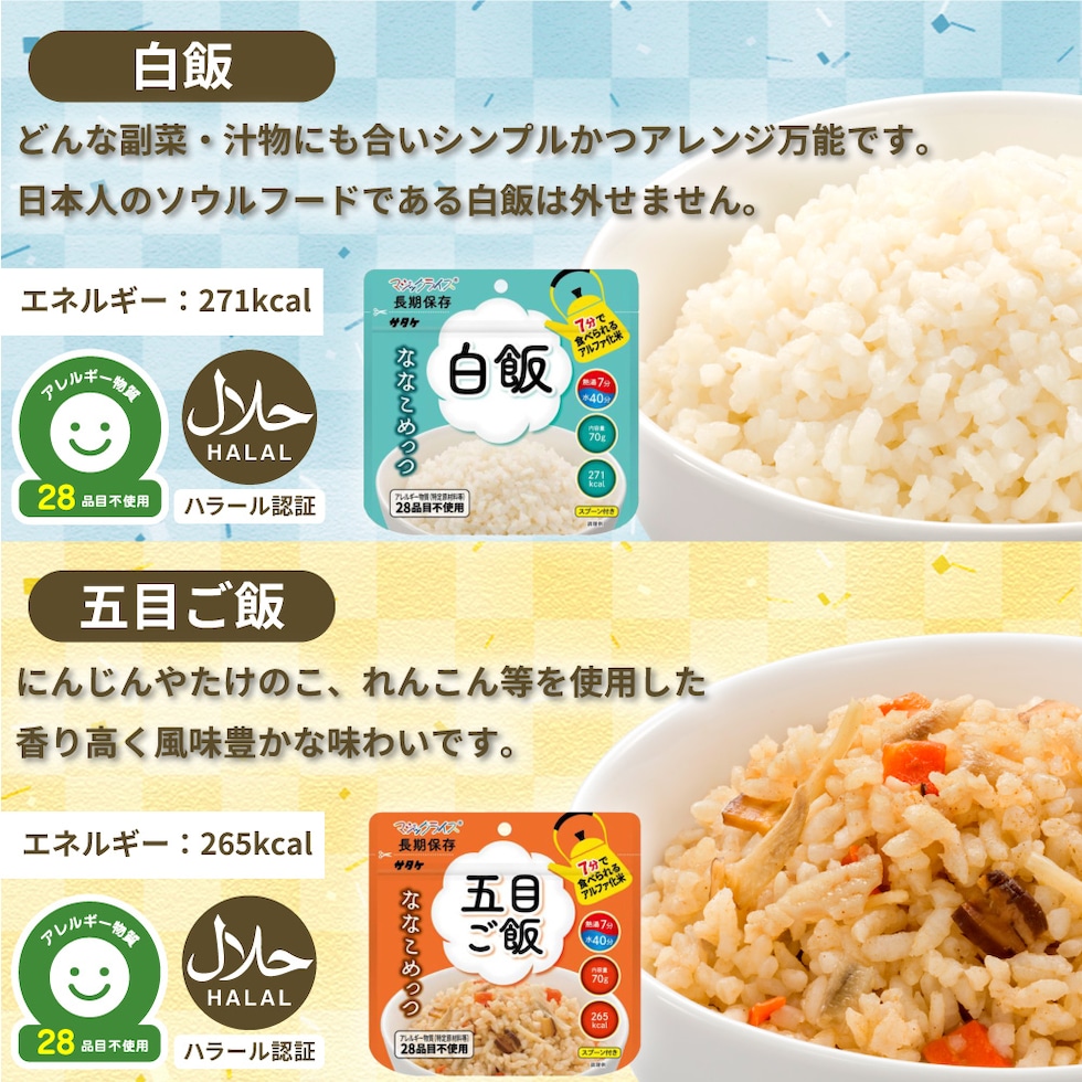 ななこめっつ 6種類 24食 非常食 アレルギー対応 7年保存 防災グッズ 防災食 28品目不使用 ごはん アルファ化米 災害 地震 避難 備蓄品 キャンプ アウトドア 非常食セット 保存食セット アソート お試し サタケ