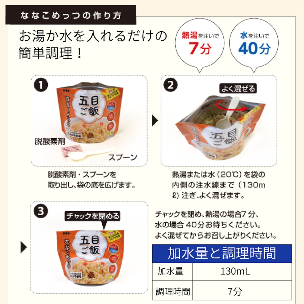 ななこめっつ 6種類 24食 非常食 アレルギー対応 7年保存 防災グッズ 防災食 28品目不使用 ごはん アルファ化米 災害 地震 避難 備蓄品 キャンプ アウトドア 非常食セット 保存食セット アソート お試し サタケのレビュー