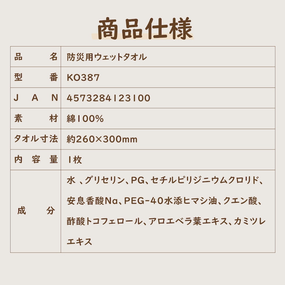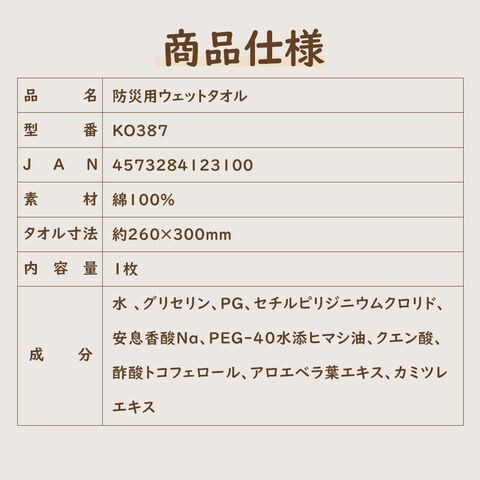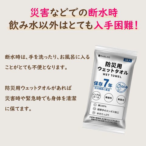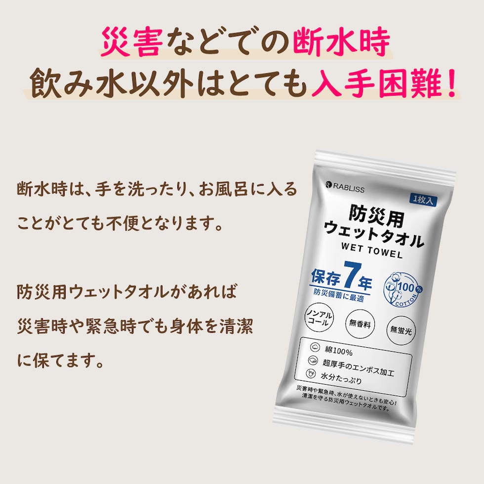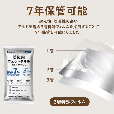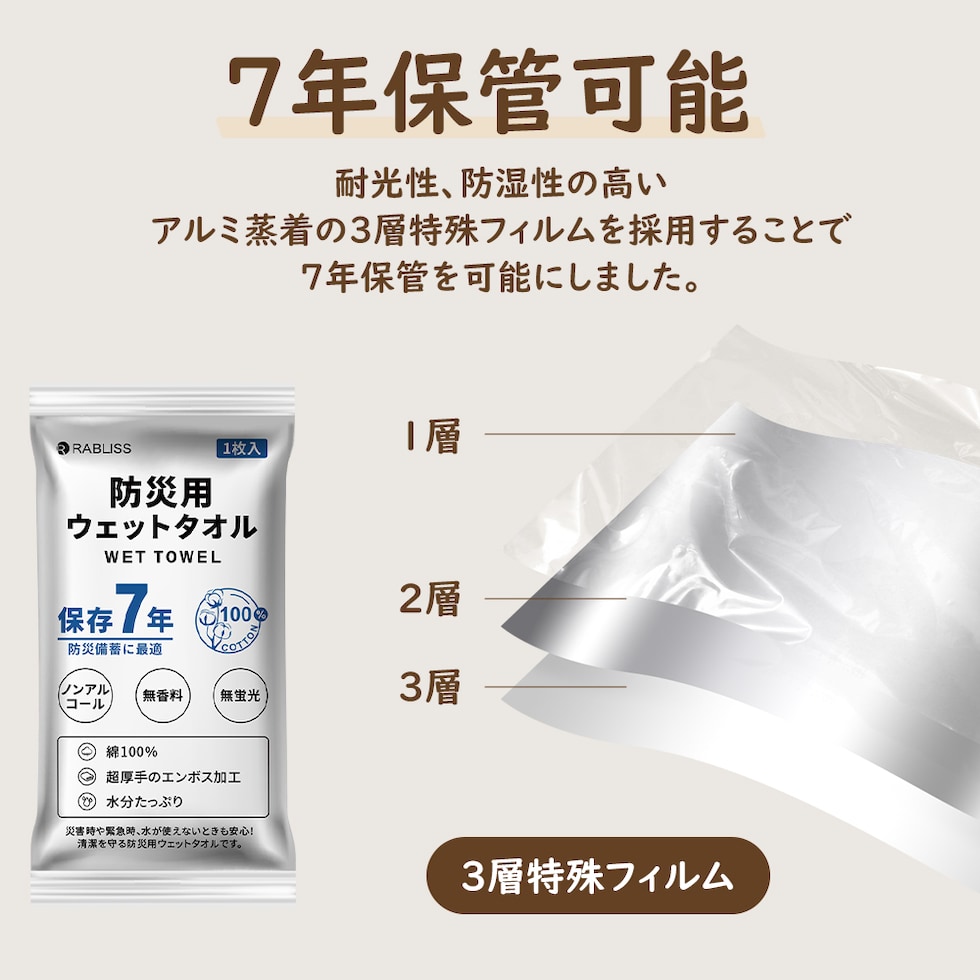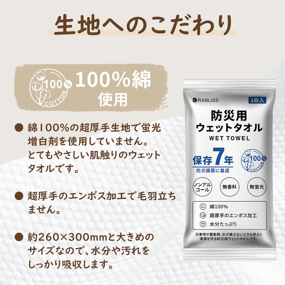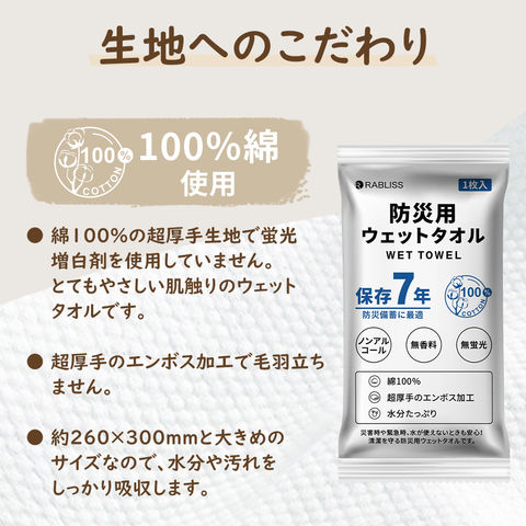 7年保存 防災用ウェットタオル 1枚入 100個セット 防災グッズ ウェットタオル 衛生用品 綿100% ノンアルコール 長期保存 厚手 清潔 断水 お手ふき からだ拭き アウトドア 介護 KO387
