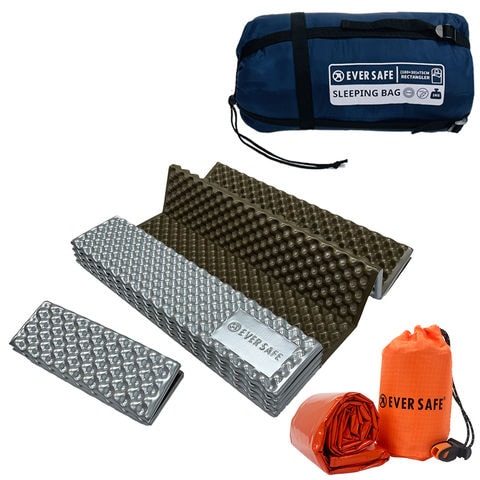 寝袋(ネイビー) 静音アルミ寝袋(巾着型) キャンプマット シングル(ゴールド) 3点セット 防災セット 防災グッズ 非常用 アウトドア キャンプ 車中泊 寝袋 防災 シュラフ アルミシート アルミマット オールシーズン 断熱 防音 EVERSAFE