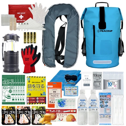 防災セット 1人用 ライフジャケット付 ドライバッグ スカイブルー 防水リュック 手動膨張式 ライフジャケット 防災士監修 水害対策 防災グッズ 非常食 保存水 ランタン 簡易トイレ 救急ポーチ 水難 アウトドア 警戒レベル3 PEACEUP L3DRLF01