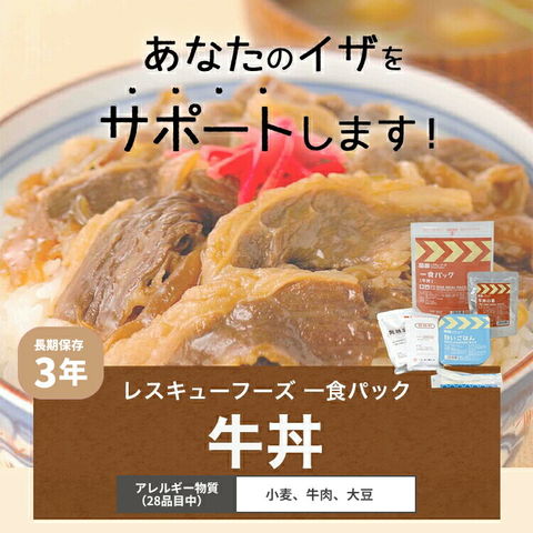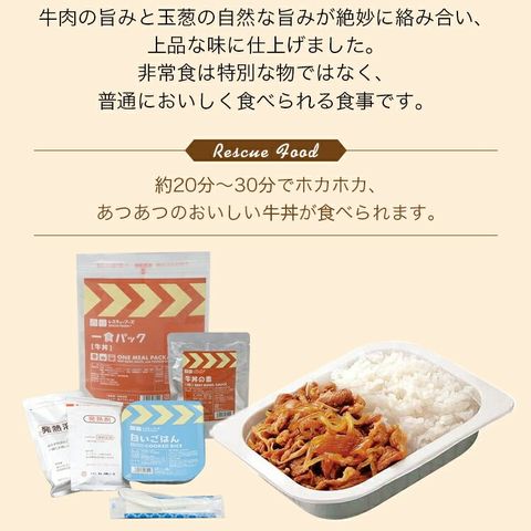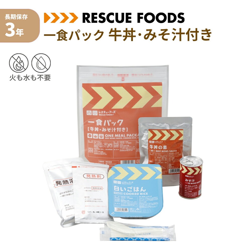 一食パック 牛丼 みそ汁付き 非常食 レスキューフーズ 3年保存 防災食 温かい 保存食 防災グッズ 日本災害食 簡単調理 発熱剤 加熱袋 備蓄品 非常用 アウトドア レトルト 缶詰 ホリカフーズ