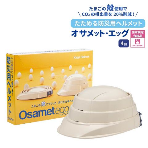 オサメットエッグ 4個 防災ヘルメット オサメット A4サイズ 防災用ヘルメット 国家検定品合格品 日本製 飛来・落下物 KAGAヘルメット 折りたたみヘルメット 折り畳み ヘルメット あご紐 つば付き 防災グッズ 頭囲55~64cm 男女兼用 大人 防災 KGO-TMG-01 加賀産業