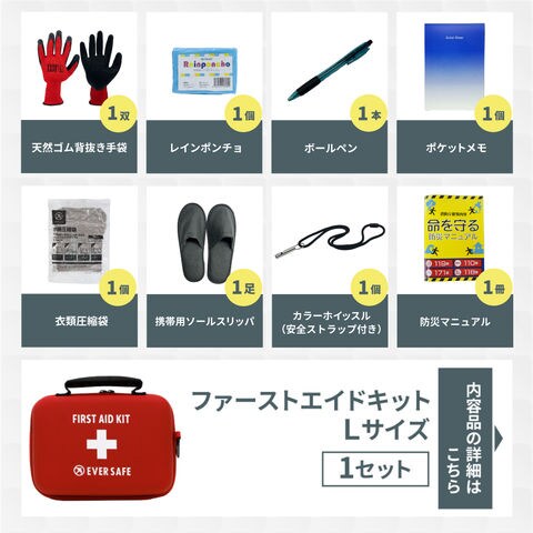 | ファーストエイドキット (Lサイズ) | 1 | 【防災士が厳選した安心の救急キット】 緊急時に必要なアイテムをコンパクトにまとめた救急セット。軽量で持ち運びに便利なので、防災用としてはもちろん、職場や旅行、アウトドアでも安心。どこでもすぐに取り出して使えるキット ケースL サイズ: (約)縦18.5 x 横22.5 x 厚み8.0 cm ファーストエイドケース (Lサイズ)×1 / 液晶体温計×1 / N95防護マスク×1 / キズ洗浄消毒×1 / 絆創膏 (Mサイズ)×12 / 絆創膏 (Lサイズ)×6 / キズあて防水パッド (S/M/L)×各1 / 滅菌ガーゼ (S/M/L)×各1 / アルコール消毒綿×4 / ハサミ×1 / ピンセット×1 /包帯 (2号/3号/4号)×各1 / 不織布三角巾×1 / 綿棒 (個包装)×10 / ニトリル手袋 (個装パッケージ入)×1 / ポリエチレン手袋 (密封個包装)×2 / 不織布テープ×1 / 安全ピン×4 / 熱可塑性エラストマー 止血帯 (ゴム) ×1 / 人工呼吸マウスピース×1 / ファーストエイドキットガイド×1 |