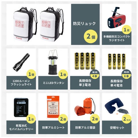 防災セット 2人用 底まで開く防災リュック 防災グッズ 防災士監修 ファーストエイドキット 避難グッズ 地震対策 災害対策 非常食 ランタン ラジオ 長期保存水 トイレ 懐中電灯 充電器 警戒レベル5 EVERSAFE L5TP02