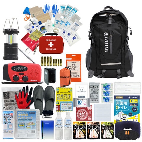 防災セット 1人用 EVERSAFEリュック (ブラック) L5ES01 防災グッズ 防災士監修 ファーストエイドキット 避難グッズ 災害対策 地震対策 トイレ 非常食 ランタン ラジオ 長期保存水 懐中電灯 警戒レベル5