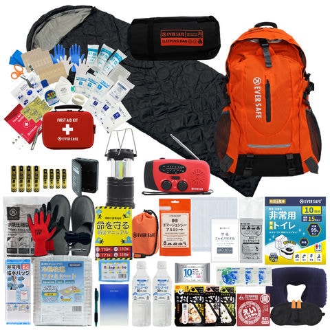 防災セット 1人用 寝袋付き EVERSAFEリュック (オレンジ) L5ESNB01 防災グッズ 防災士監修 ファーストエイドキット 避難グッズ 災害対策 地震対策 トイレ 非常食 ランタン ラジオ 長期保存水 懐中電灯 警戒レベル5