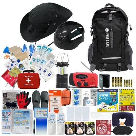 防災セット 1人用 ハット型ヘルメット付 EVERSAFEリュック (ブラック) L5ESHT01 防災グッズ 防災士監修 ファーストエイドキット 避難グッズ 災害対策 地震対策 トイレ 非常食 ランタン ラジオ 長期保存水 警戒レベル5
