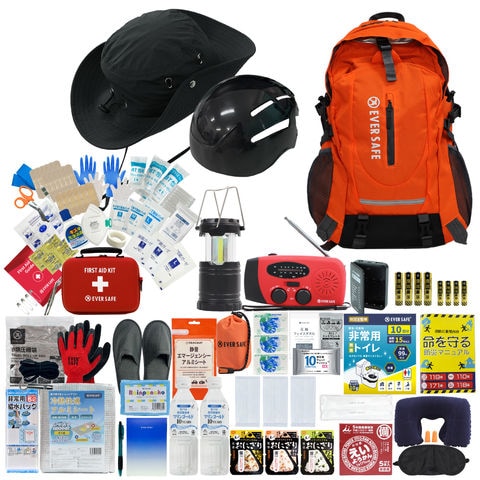 防災セット 1人用 ハット型ヘルメット付 EVERSAFEリュック (オレンジ) L5ESHT01 防災グッズ 防災士監修 ファーストエイドキット 避難グッズ 災害対策 地震対策 トイレ 非常食 ランタン ラジオ 長期保存水 警戒レベル5