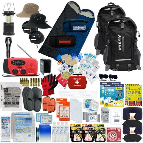 防災セット 2人用 ハット型ヘルメット付き EVERSAFEリュック (ブラック×ブラック) L5ESHTNB02 防災グッズ 防災士監修 ファーストエイドキット 避難グッズ 災害対策 地震対策 トイレ 非常食 長期保存水 防災 警戒レベル5 EVERSAFE