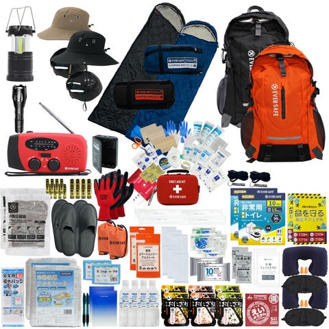 防災セット 2人用 ハット型ヘルメット付き EVERSAFEリュック (ブラック×オレンジ) L5ESHTNB02 防災グッズ 防災士監修 ファーストエイドキット 避難グッズ 災害対策 地震対策 トイレ 非常食 長期保存水 防災 警戒レベル5 EVERSAFE