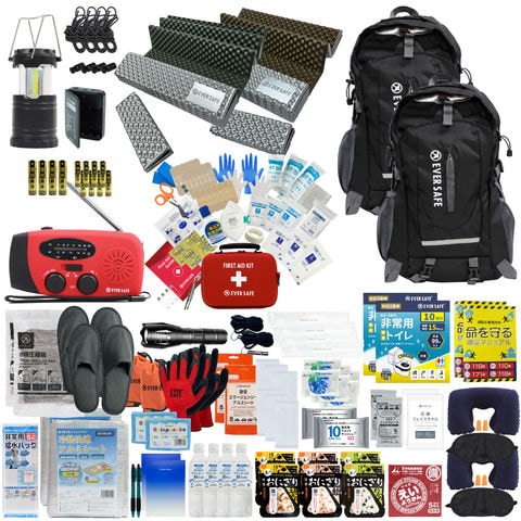 防災セット 2人用 マット付き EVERSAFEリュック (ブラック×ブラック) L5ESMT02 防災士監修 ファーストエイドキット 避難グッズ 災害対策 地震対策 トイレ 非常食 ランタン ラジオ 長期保存水 懐中電灯 警戒レベル5