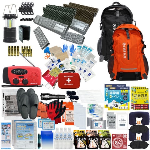 防災セット 2人用 マット付き EVERSAFEリュック (ブラック×オレンジ) L5ESMT02 防災士監修 ファーストエイドキット 避難グッズ 災害対策 地震対策 トイレ 非常食 ランタン ラジオ 長期保存水 懐中電灯 警戒レベル5