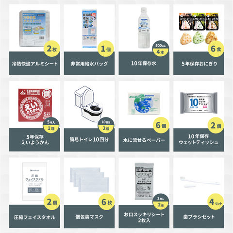 | ファーストエイドキット (Lサイズ) | 1 | 【防災士が厳選した安心の救急キット】 緊急時に必要なアイテムをコンパクトにまとめた救急セット。軽量で持ち運びに便利なので、防災用としてはもちろん、職場や旅行、アウトドアでも安心。どこでもすぐに取り出して使えるキット ケースL サイズ: (約)縦18.5 x 横22.5 x 厚み8.0 cm ファーストエイドケース (Lサイズ)×1 / 液晶体温計×1 / N95防護マスク×1 / キズ洗浄消毒×1 / 絆創膏 (Mサイズ)×12 / 絆創膏 (Lサイズ)×6 / キズあて防水パッド (S/M/L)×各1 / 滅菌ガーゼ (S/M/L)×各1 / アルコール消毒綿×4 / ハサミ×1 / ピンセット×1 /包帯 (2号/3号/4号)×各1 / 不織布三角巾×1 / 綿棒 (個包装)×10 / ニトリル手袋 (個装パッケージ入)×1 / ポリエチレン手袋 (密封個包装)×2 / 不織布テープ×1 / 安全ピン×4 / 熱可塑性エラストマー 止血帯 (ゴム) ×1 / 人工呼吸マウスピース×1 / ファーストエイドキットガイド×1 |