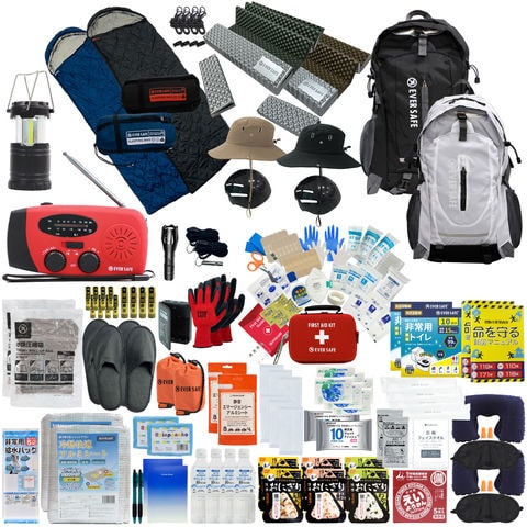 防災セット 2人用 ハット型ヘルメット・寝袋・マット付き EVERSAFEリュック (ブラック×ホワイト) L5ESHTNBMT02 防災グッズ 防災士監修 ファーストエイドキット 避難グッズ 災害対策 地震対策 トイレ 非常食 ランタン 保存水 警戒レベル5 EVERSAFE