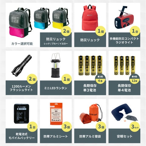 | 防災リュック | 2 | カラー:レッド/ブルー/イエロー サイズ:(約)高さ55x横幅45x奥行19cm 容量:(約)40L 本体重量:(約)850g 防災用ピクトグラム、蛍光バンド付き |