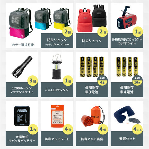 | 防災リュック | 2 | カラー:レッド/ブルー/イエロー サイズ:(約)高さ55x横幅45x奥行19cm 容量:(約)40L 本体重量:(約)850g 防災用ピクトグラム、蛍光バンド付き |