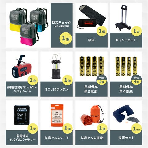 | 防災リュック | 1 | カラー:レッド/ブルー/イエロー サイズ:(約)高さ55x横幅45x奥行19cm 容量:(約)40L 本体重量:(約)850g 防災用ピクトグラム、蛍光バンド付き |