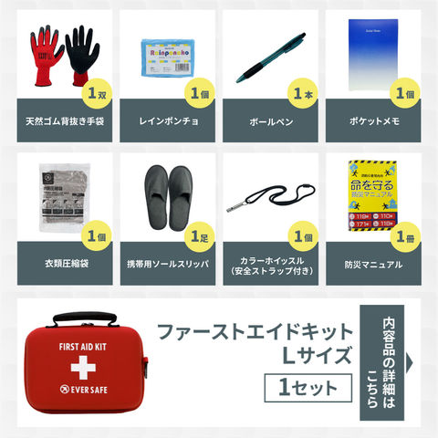 | ファーストエイドキット (Lサイズ) | 1 | 【防災士が厳選した安心の救急キット】 緊急時に必要なアイテムをコンパクトにまとめた救急セット。軽量で持ち運びに便利なので、防災用としてはもちろん、職場や旅行、アウトドアでも安心。どこでもすぐに取り出して使えるキット ケースL サイズ: (約)縦18.5 x 横22.5 x 厚み8.0 cm ファーストエイドケース (Lサイズ)×1 / 液晶体温計×1 / N95防護マスク×1 / キズ洗浄消毒×1 / 絆創膏 (Mサイズ)×12 / 絆創膏 (Lサイズ)×6 / キズあて防水パッド (S/M/L)×各1 / 滅菌ガーゼ (S/M/L)×各1 / アルコール消毒綿×4 / ハサミ×1 / ピンセット×1 /包帯 (2号/3号/4号)×各1 / 不織布三角巾×1 / 綿棒 (個包装)×10 / ニトリル手袋 (個装パッケージ入)×1 / ポリエチレン手袋 (密封個包装)×2 / 不織布テープ×1 / 安全ピン×4 / 熱可塑性エラストマー 止血帯 (ゴム) ×1 / 人工呼吸マウスピース×1 / ファーストエイドキットガイド×1 |
