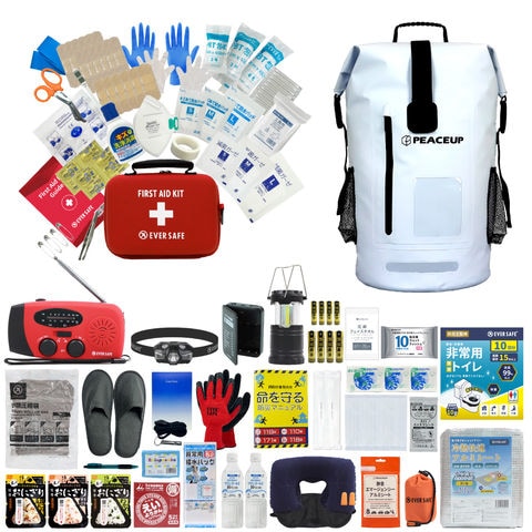 防災セット 1人用 ヘッドライト付きドライバッグ ホワイト L5DR01 防水リュック 防災グッズ 防災士監修 ファーストエイドキット トイレ 非常食 避難グッズ 水害対策 ランタン ラジオ 長期保存水 懐中電灯 警戒レベル5 EVERSAFE
