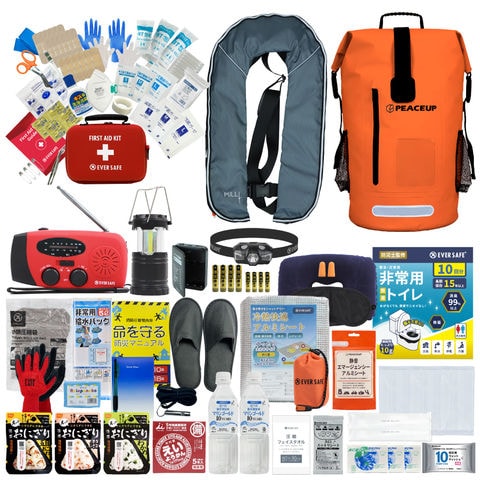防災セット 1人用 ヘッドライト・ライフジャケット付きドライバッグ オレンジ L5DRLF01 防水リュック防災グッズ 防災士監修 ファーストエイドキット トイレ 非常食 避難グッズ 水害対策 ランタン 懐中電灯 警戒レベル5 EVERSAFE