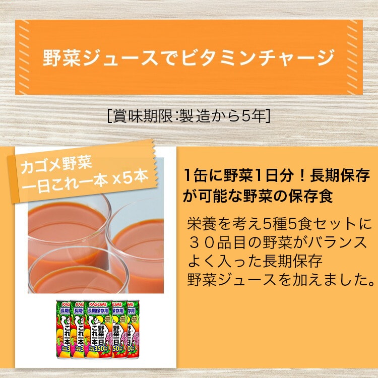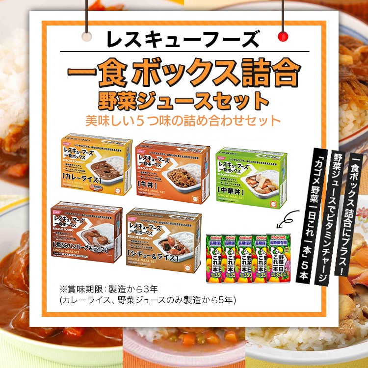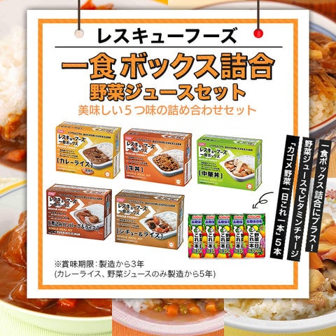 一食ボックス カゴメ野菜ジュース5本付き 5種類 5食セット 非常食セット レスキューフーズ 長期保存 防災食 温かい 防災グッズ ジュース 保存食 カゴメ KAGOME レトルト ホリカフーズ