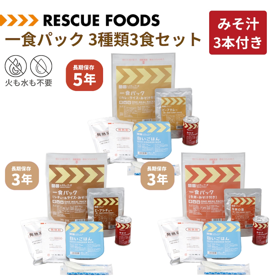 一食パック みそ汁付き 3種類3食セット カレーライス 牛丼 シチュー&ライス 非常食セット レスキューフーズ 長期保存 防災食 温かい 保存食 防災グッズ 日本災害食 簡単調理 備蓄品 非常用 レトルト ホリカフーズ