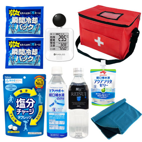 熱中症対策キット 黒球式熱中症指数計付き 9点 レッド 10セット 熱中症対策用品 暑さ対策 熱中症対策グッズ WBGT 工事現場 農作業 野外作業 アウトドア 屋外 塩分補給 塩分チャージ 持ち運び スポーツ ひんやり 暑さ指数 熱中アラーム ATB010K PEACEUP