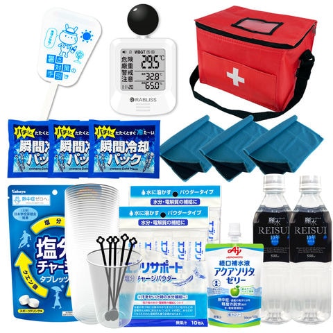 熱中症対策キット シェア 黒球式熱中症指数計付き 39点 レッド 10セット 熱中症対策用品 複数人向け 塩分補給パウダー 熱中症対策グッズ 暑さ対策 WBGT 工事現場 野外作業 アウトドア 屋外 塩分補給 塩分チャージ まとめ買い スポーツ ひんやり ATD010K PEACEUP