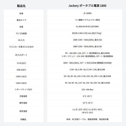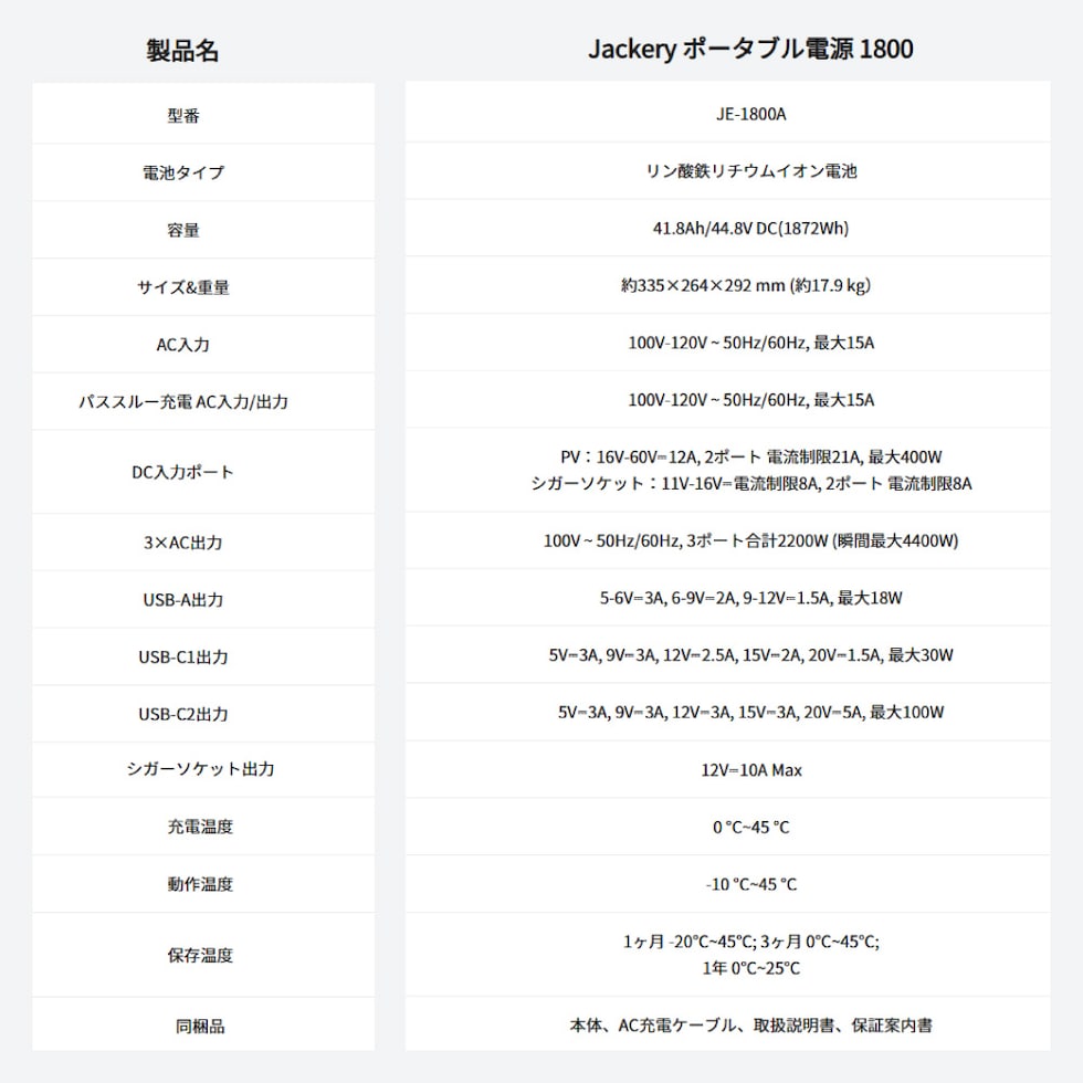 ポータブル電源 1800 ポタ電 ポータブルバッテリー 1872Wh 蓄電池 長寿命バッテリー 防災グッズ 非常用電源 アウトドア キャンプ 車中泊 停電対策 防災 定格出力2200W パススルー機能 リチウムイオン電池 JE-1800A Jackery
