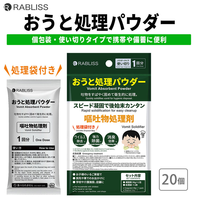 おうと処理パウダー 1回分 20個 衛生用品 嘔吐処理 凝固剤 おう吐 嘔吐 吐瀉 ウイルス 感染症対策 食中毒 処理袋 衛生 除菌 消臭 まとめ買い 防災グッズ KO405 RABLISS