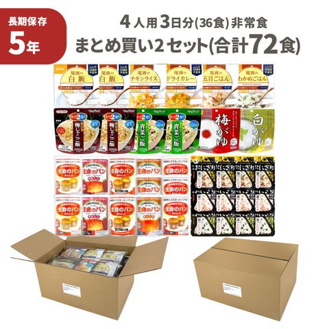 非常食セット 5年保存 まとめ買い 2セット ( 72食 ) 4人用 3日分 36食 2箱 団体向け 保存食 防災食 非常用食品 ケース販売 ご飯 お米 アルファ米 パン おにぎり 5年 3日間分 8人 オフィス 災害食 備蓄 PEACEUP