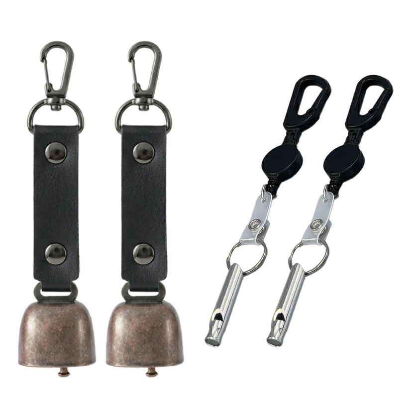 熊よけ鈴 カラビナ付きリール小 アルミホイッスル 3点 2個セット ブラック 熊鈴 消音機能付き マグネット 磁石 消音 PUレザー 熊よけ ホイッスル 鈴 笛 登山 まとめ買い EVERSAFE (メール便1セットまで)