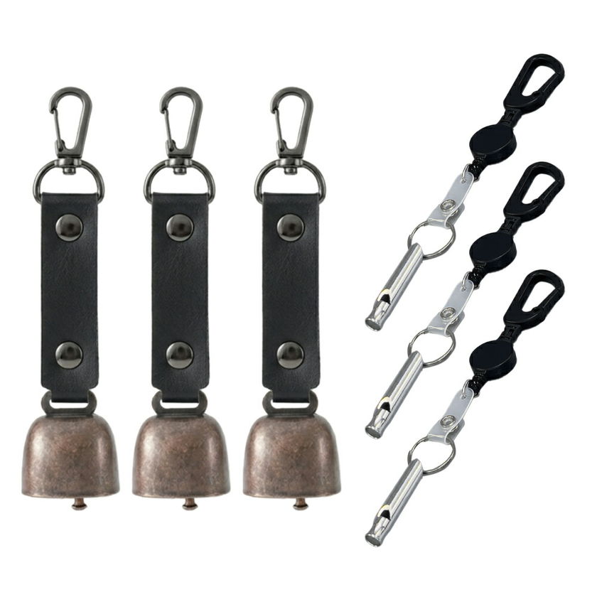 熊よけ鈴 カラビナ付きリール小 アルミホイッスル 3点 3個セット ブラック 熊鈴 消音機能付き マグネット 磁石 消音 PUレザー 熊よけ ホイッスル 鈴 笛 登山 まとめ買い EVERSAFE (メール便1セットまで)