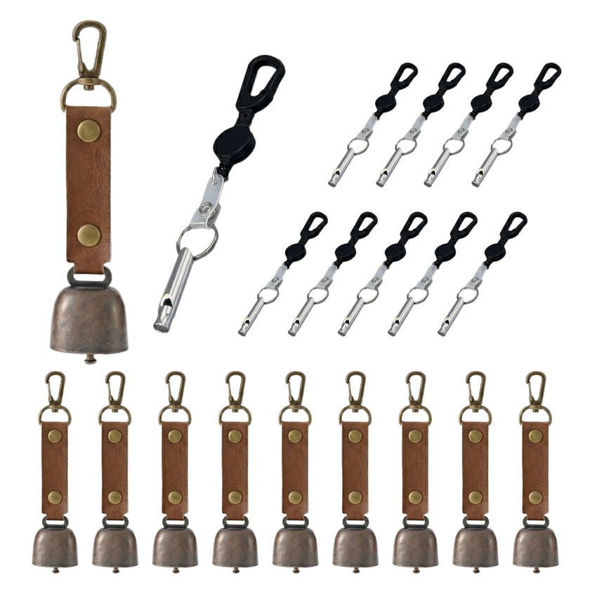熊よけ鈴 カラビナ付きリール小 アルミホイッスル 3点セット ブラウン 10個 熊鈴 消音機能付き マグネット 磁石 消音 PUレザー 熊よけ ホイッスル 鈴 笛 登山 まとめ買い EVERSAFE