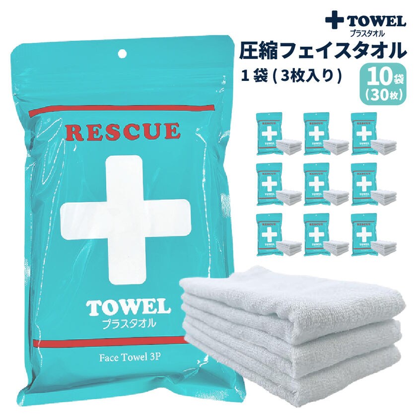 PLUS TOWEL 10袋 (30枚) 防災グッズ プラスタオル 緊急時 フェイスタオル 真空圧縮加工 省スペース 応急処置 代用品 三角巾 包帯 止血 応急マスク 防災頭巾 マフラー 意思表示 救助 PT222031
