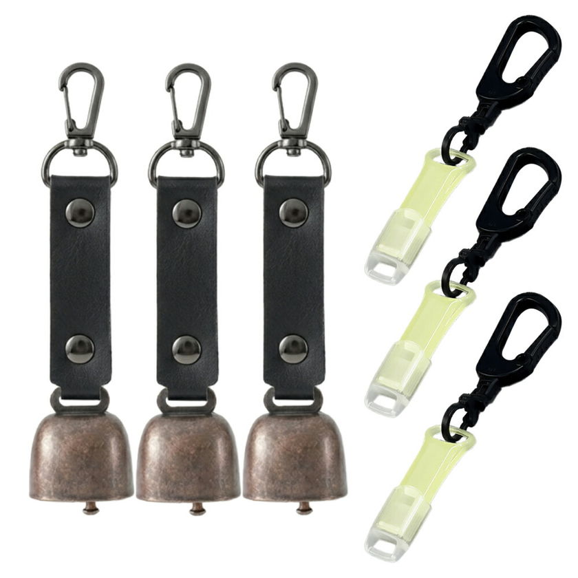 熊よけ鈴 蓄光ホイッスル キャップ カラビナリング付き 4点 ブラック 3個セット 熊鈴 消音機能付き マグネット 磁石 カラビナ 消音 PUレザー 熊よけ 対策 鈴 笛 緊急ホイッスル まとめ買い EVERSAFE (メール便1セットまで)