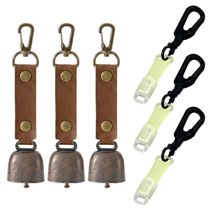熊よけ鈴 蓄光ホイッスル キャップ カラビナリング付き 4点 ブラウン 3個セット 熊鈴 消音機能付き マグネット 磁石 カラビナ 消音 PUレザー 熊よけ 対策 鈴 笛 緊急ホイッスル まとめ買い EVERSAFE (メール便1セットまで)