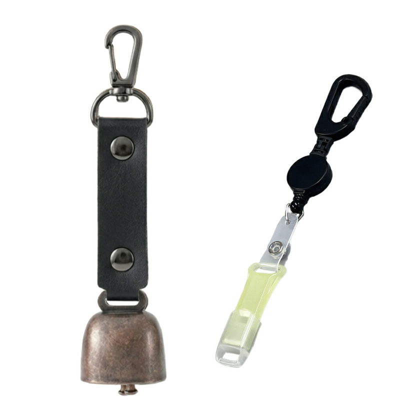 熊よけ鈴 カラビナ付きリール小 蓄光ホイッスル キャップ 4点セット ブラック 1個 熊鈴 消音機能付き マグネット 消音 PUレザー 熊よけ ホイッスル 鈴 笛 登山 まとめ買い EVERSAFE (メール便3個まで)