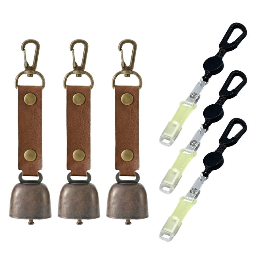 熊よけ鈴 カラビナ付きリール小 蓄光ホイッスル キャップ 4点 3個セット ブラウン 熊鈴 消音機能付き マグネット 消音 PUレザー 熊よけ ホイッスル 鈴 笛 登山 まとめ買い EVERSAFE (メール便1セットまで)