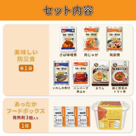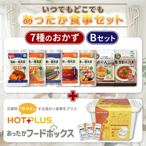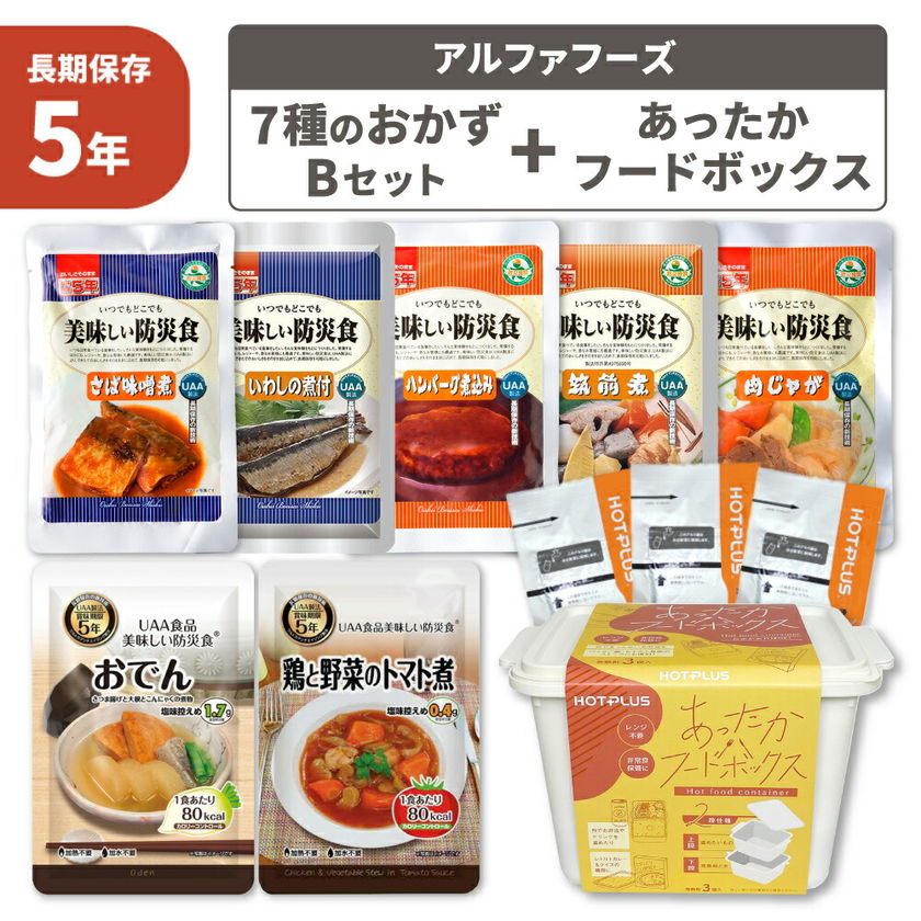 7種のおかず Bセット 5年保存 非常食セット おかず 保存食 防災食 惣菜 HOTPLUS あったかフードボックス 発熱剤付 さば味噌煮 肉じゃが 筑前煮 いわしの煮付 ハンバーグ煮込み おでん 鶏と野菜のトマト煮 セット販売 詰め合わせ 長期保存 PEACEUP