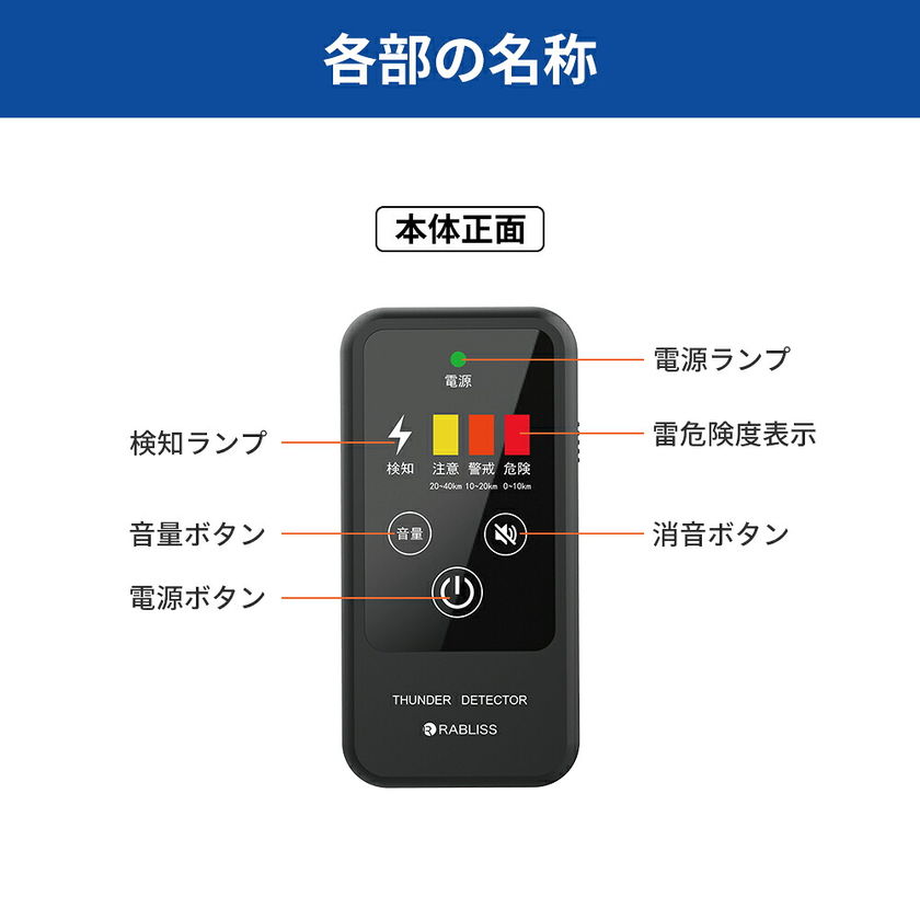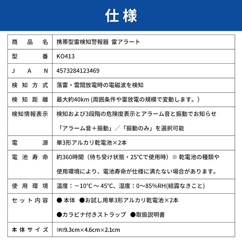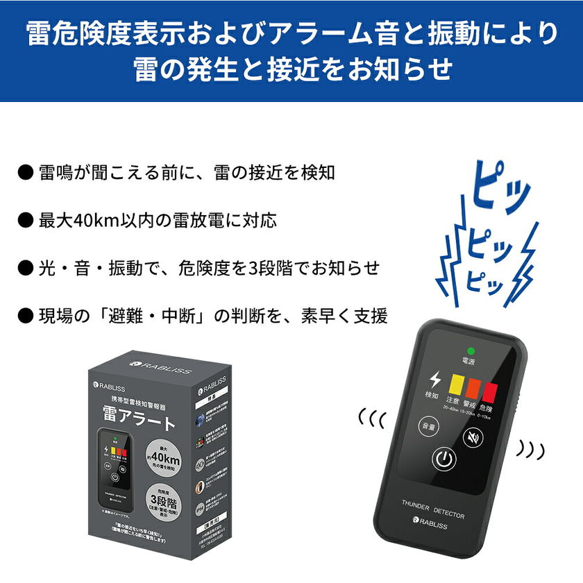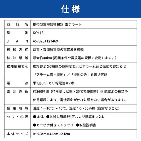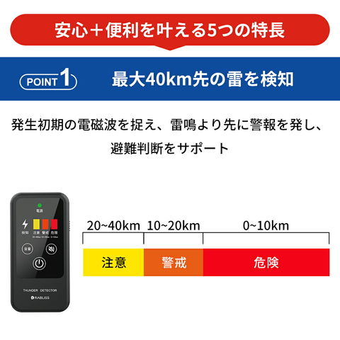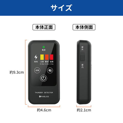 携帯型雷検知警報器 雷アラート 雷検知器 防災グッズ 雷対策 小型 軽量 防塵 防滴 IP54 光 音 振動 3段階警報 高感度 乾電池式 アウトドア ゴルフ 災害対策 落雷 KO413 RABLISS