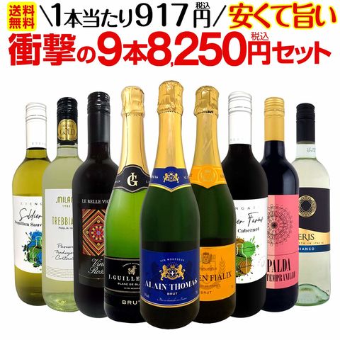 【送料無料】第63弾!当店最安級!1本あたり917円(税込)!限界ギリギリまでお買い求めやすくしました!安くて旨いワインばかりを詰め込んだ衝撃の9本8250円(税込)セット! 京橋ワイン