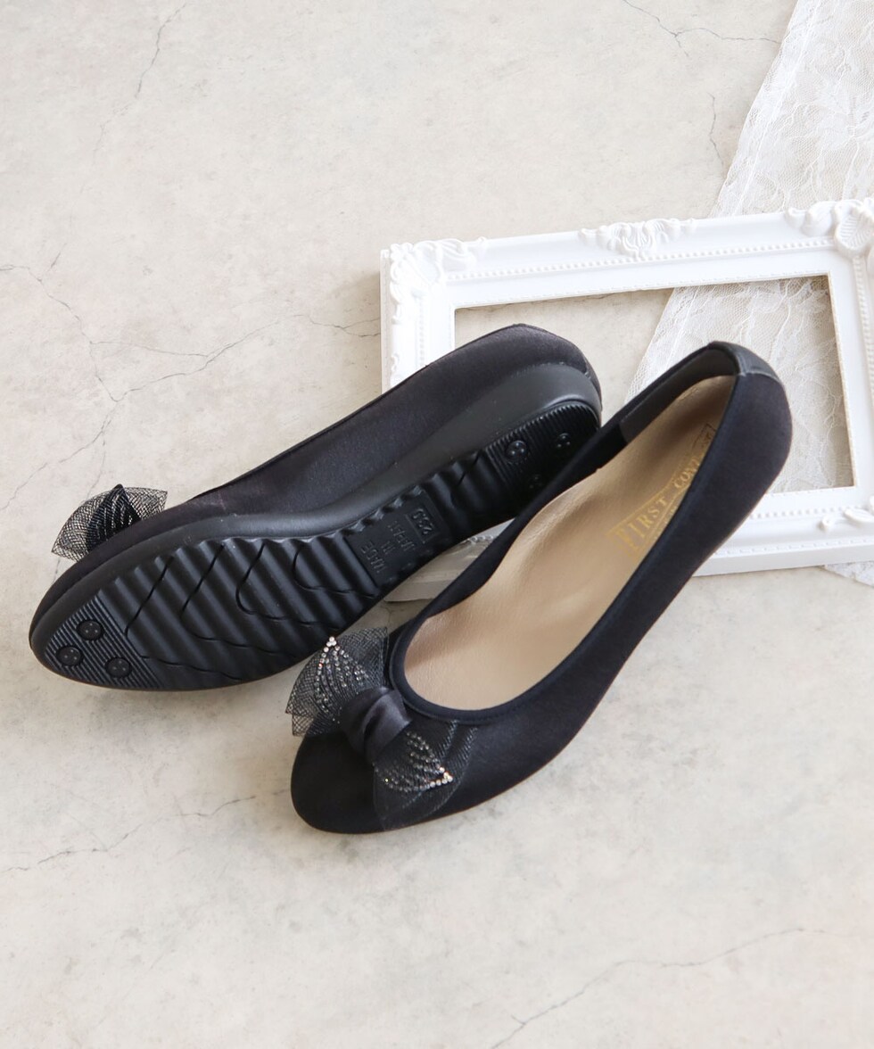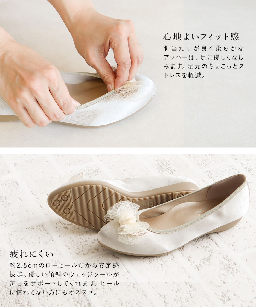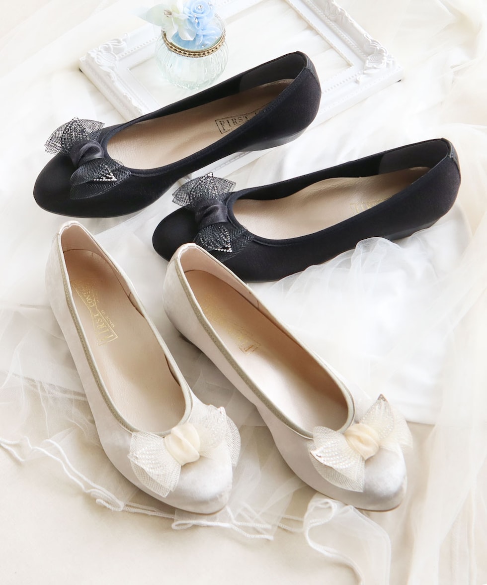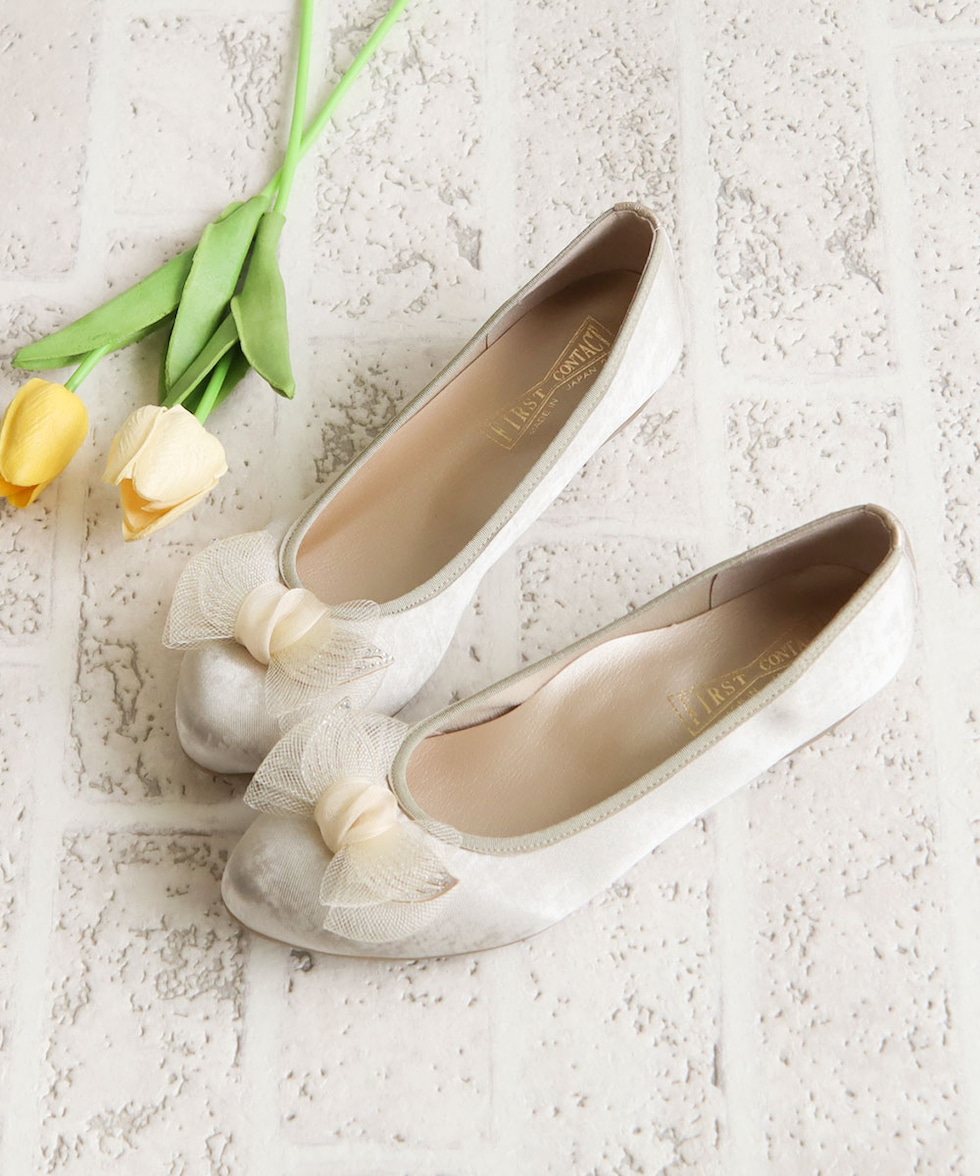 足の形が綺麗に見えるアーモンドトゥに、ワントーンのチュールリボンが上品な可愛さを演出してくれます。