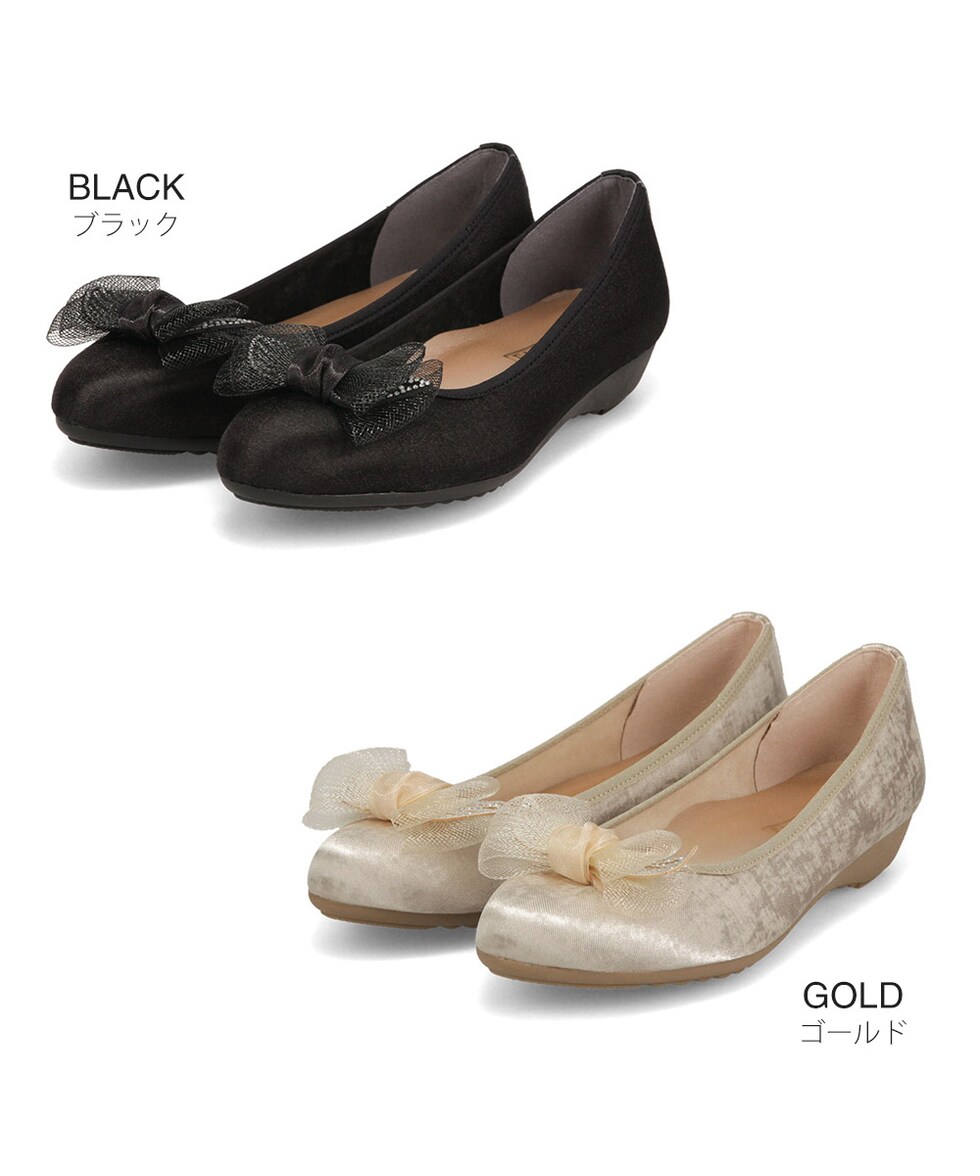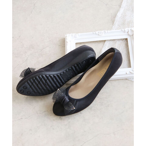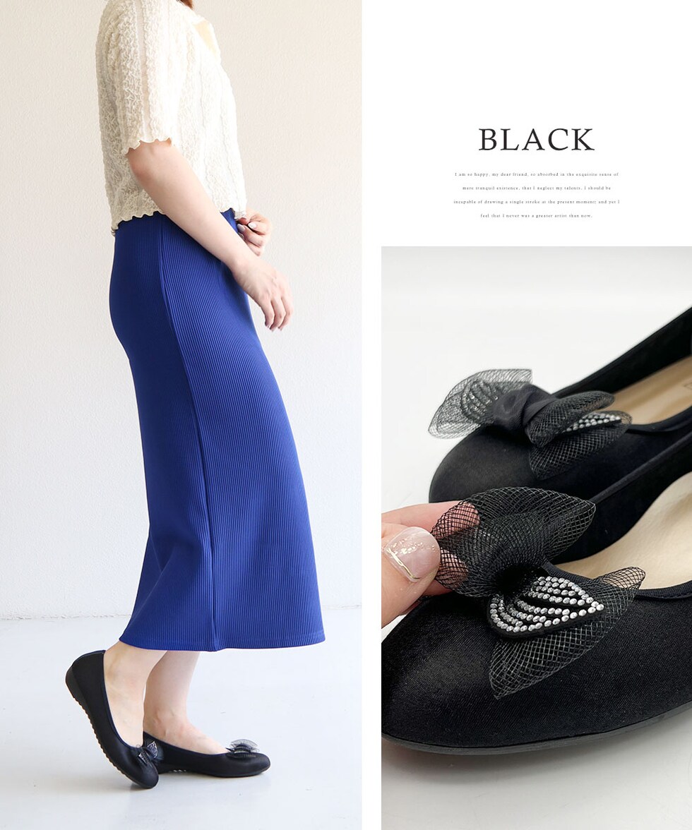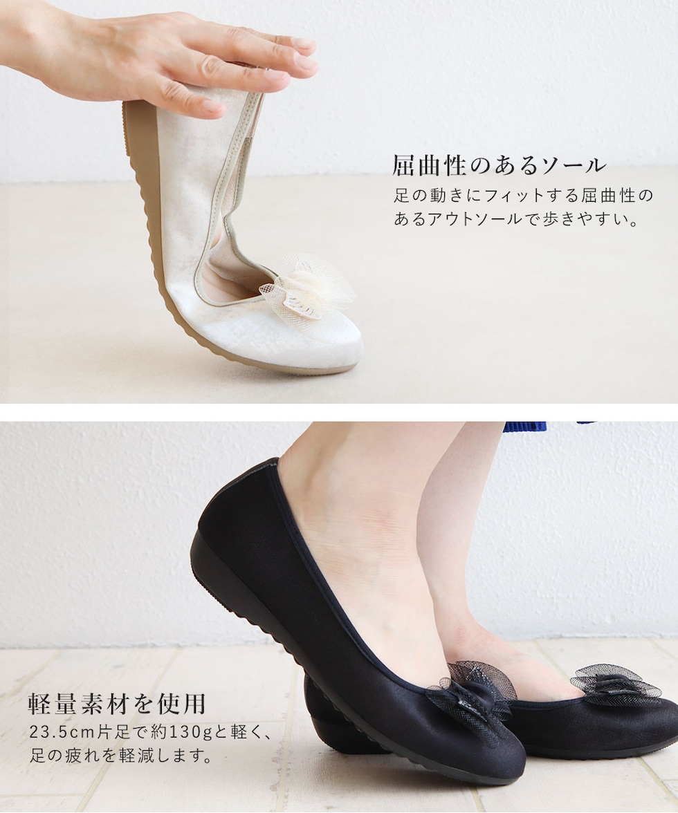 足の形が綺麗に見えるアーモンドトゥに、ワントーンのチュールリボンが上品な可愛さを演出してくれます。