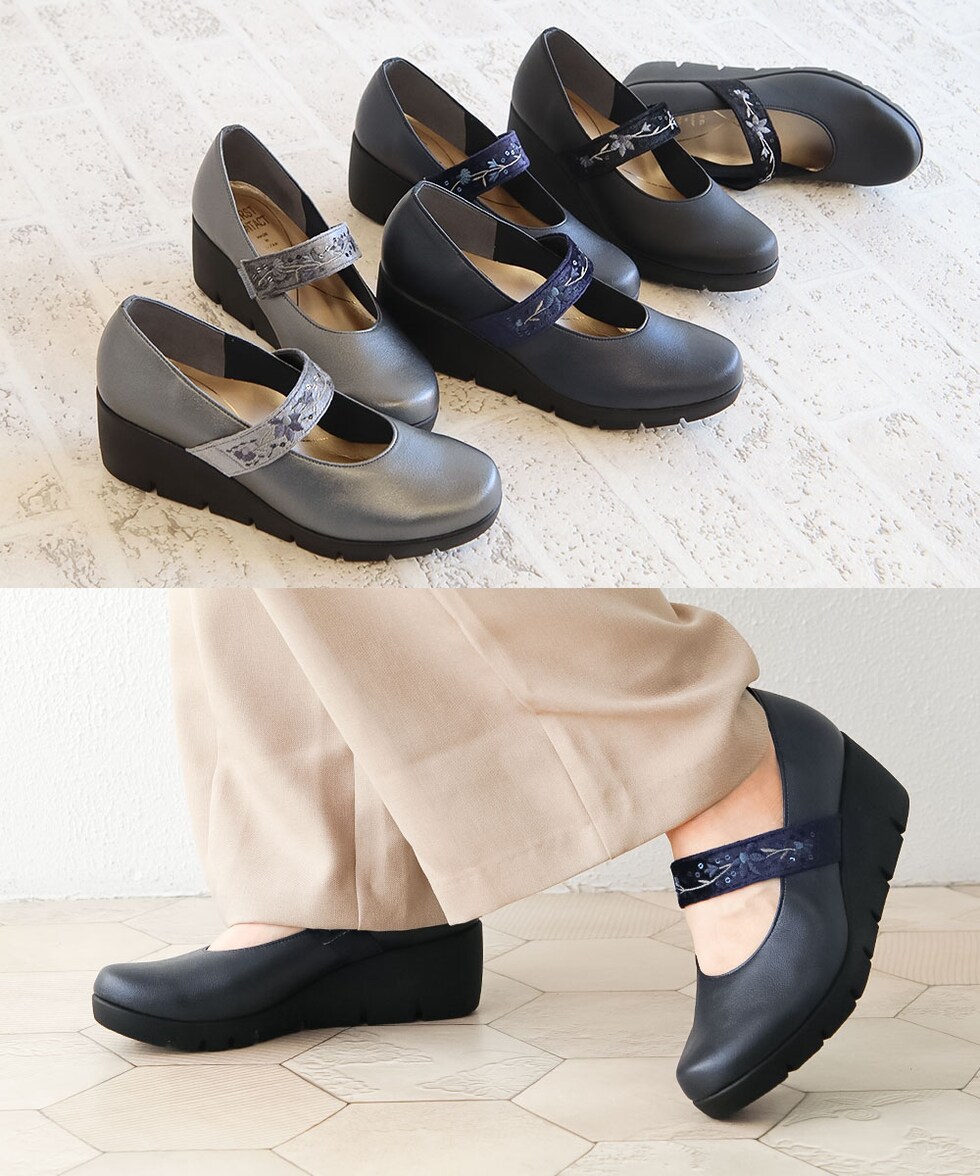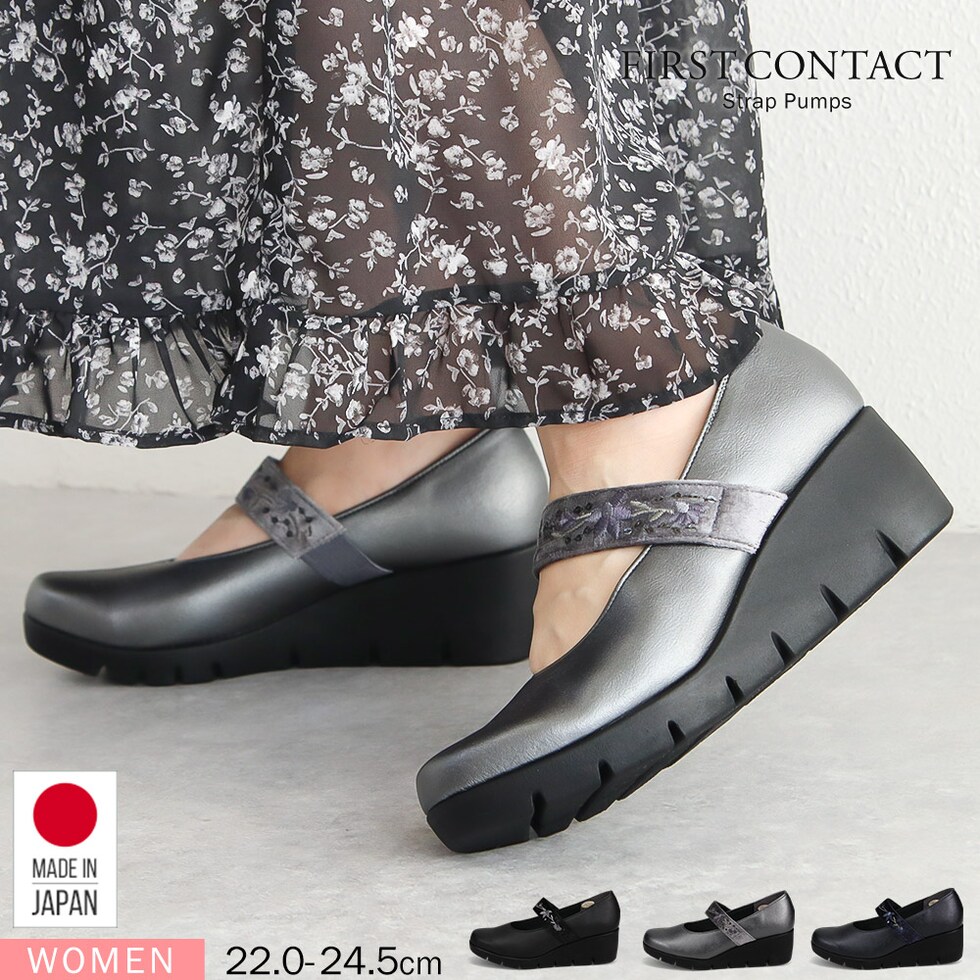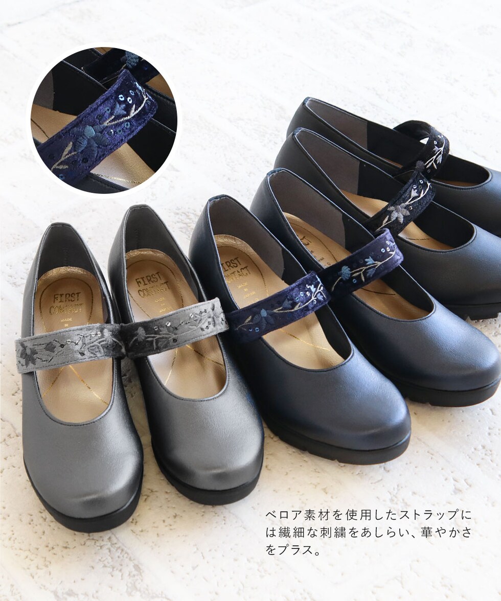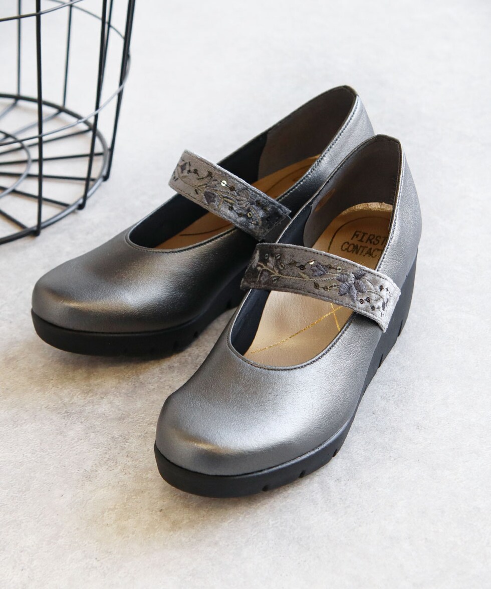 ファーストコンタクト パンプス レディース ウェッジソール 5.5センチ ストラップ 婦人靴 ラウンドトゥ 花柄 ネイビー グレー 日本製 39611
